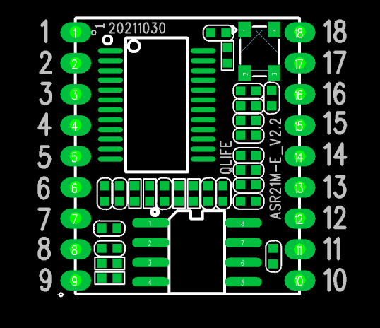 模组为单面贴装,两面出脚,模块支持单麦克风输入,可以直接接入模块;同时支持真人语音回复,可以直接驱动喇叭,功放芯片的功率可以达到 3W。